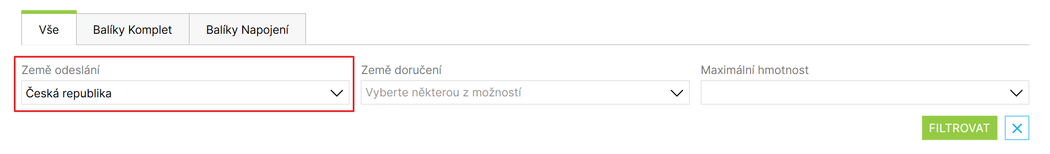 Mezi přepravci můžete snadno filtrovat – podle Země odeslání (odkud expedujete), Země doručení nebo Maximální hmotnosti. Odesílání je aktuálně podporováno pouze z České republiky nebo Slovenska. Nabídka přepravců se může lišit podle vybrané Země odeslání.