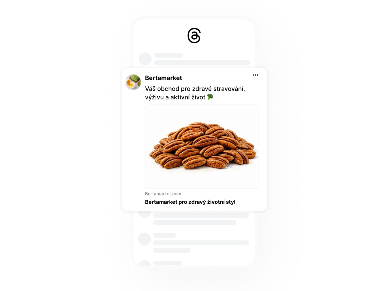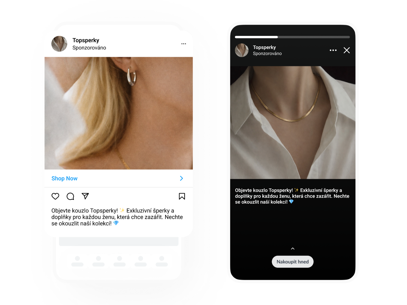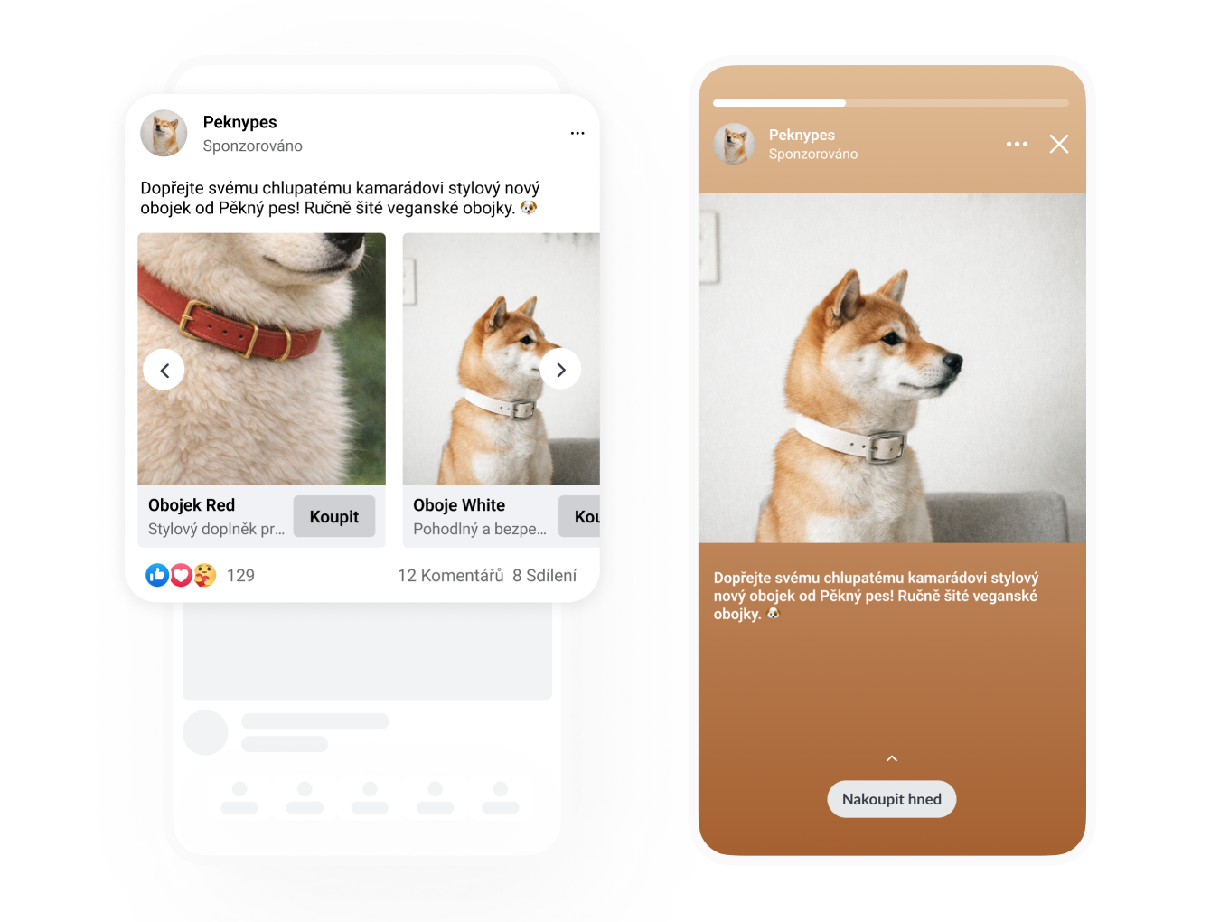 - Produktovou reklamu – produkty se automaticky zobrazují uživatelům při procházení Facebooku a Instagramu (vždy s obrázkem, cenou a odkazem z e-shopu),